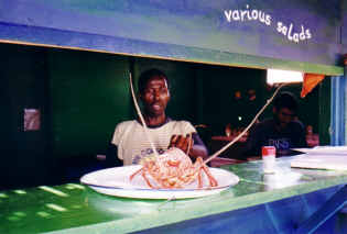 Es gibt die übliche einfache Küche. Wenn Mohammed kocht, darf man sich freuen! Auf diesem Bild gabs Hummer! Ein Fischer hatte ihn gefangen und niemand wollte ihm mehr, da die Saison gerade vorbei war und es keine Touristen mehr gab... wir freuten uns!